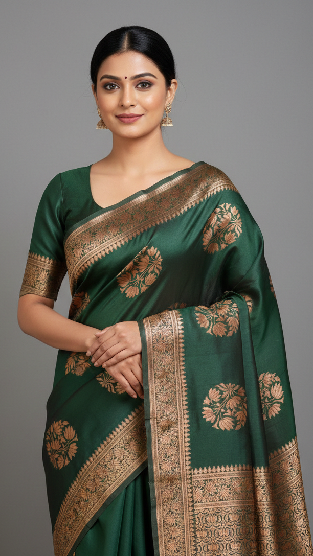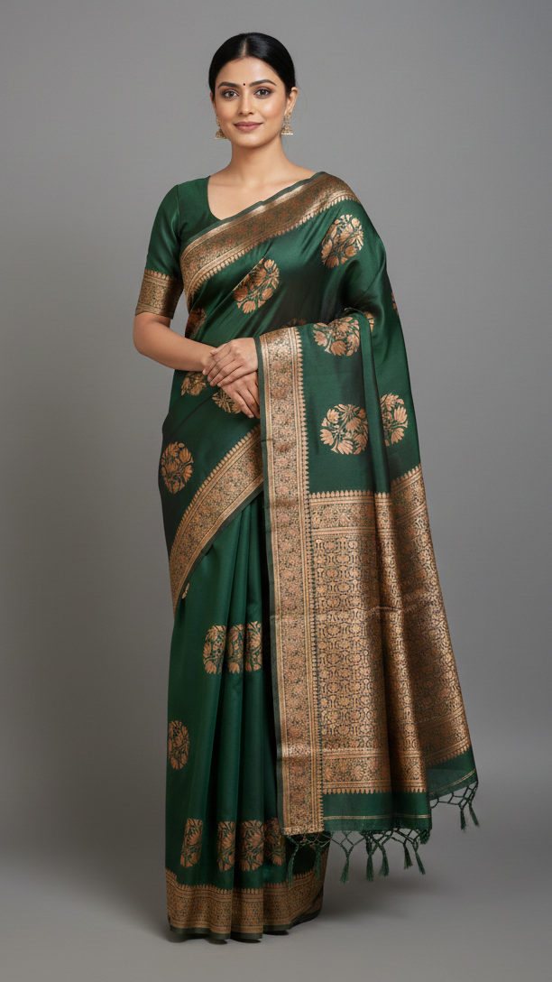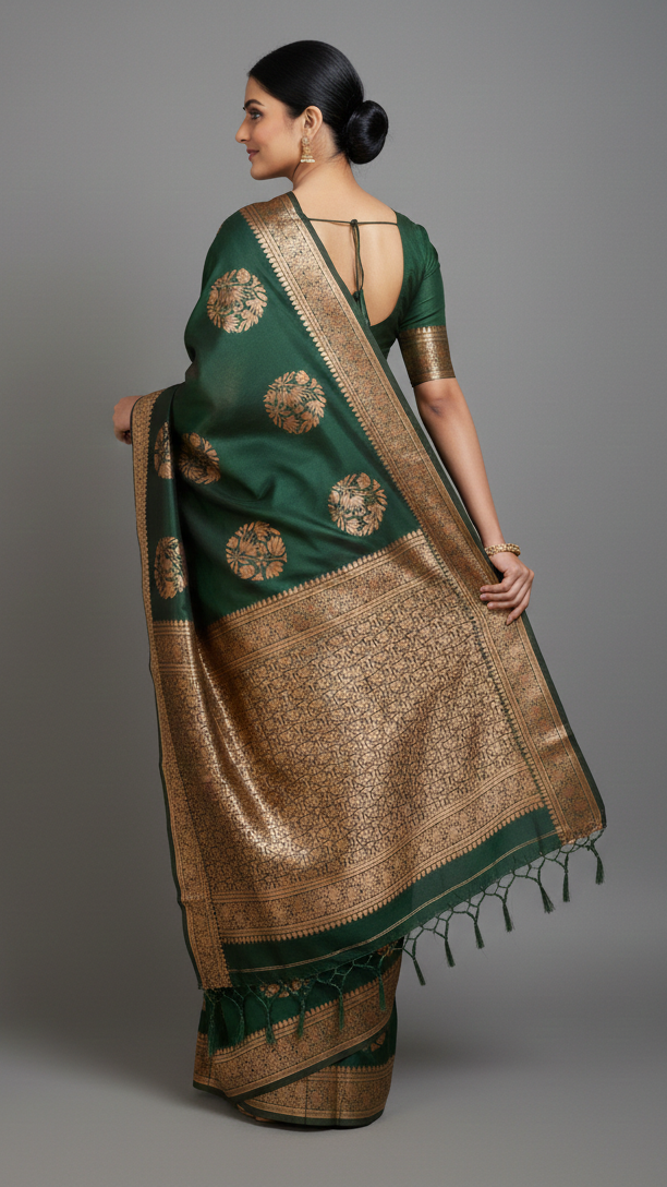 Step into a world of timeless elegance with the “Aranya” Heritage Silk Saree. This masterpiece features a deep, soul-soothing forest green base that exudes a quiet yet powerful grace. Adorned with large, ornate circular floral motifs (Buttas) woven in rich antique gold zari, this saree is designed for moments that require a truly regal presence.