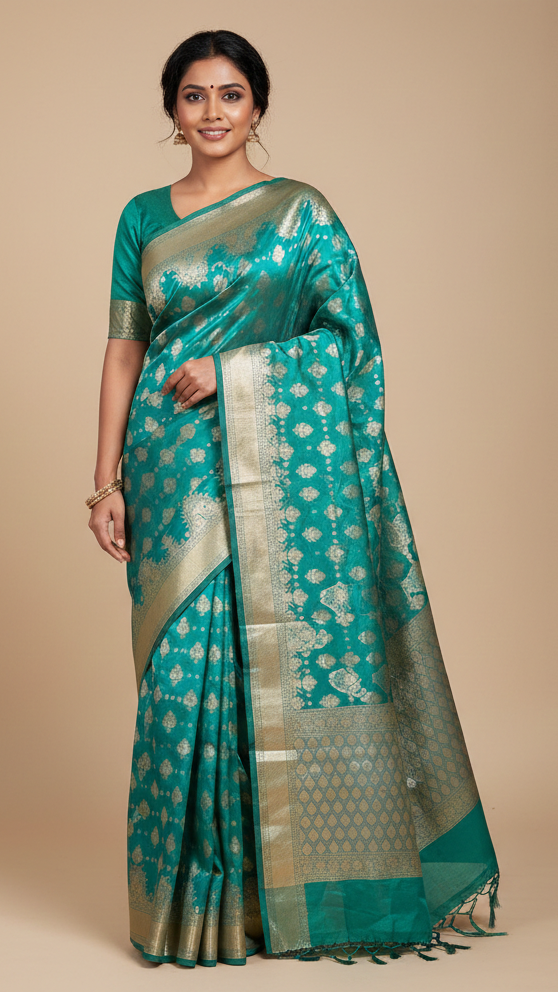 The “Aura” saree is a celebration of vibrant color and traditional craftsmanship. Set on a mesmerizing teal/sea green base, this saree features a luminous sheen that shifts beautifully with movement. The body is adorned with intricate gold floral “Buttis” (motifs), creating a rich, festive look that is perfect for celebratory occasions.